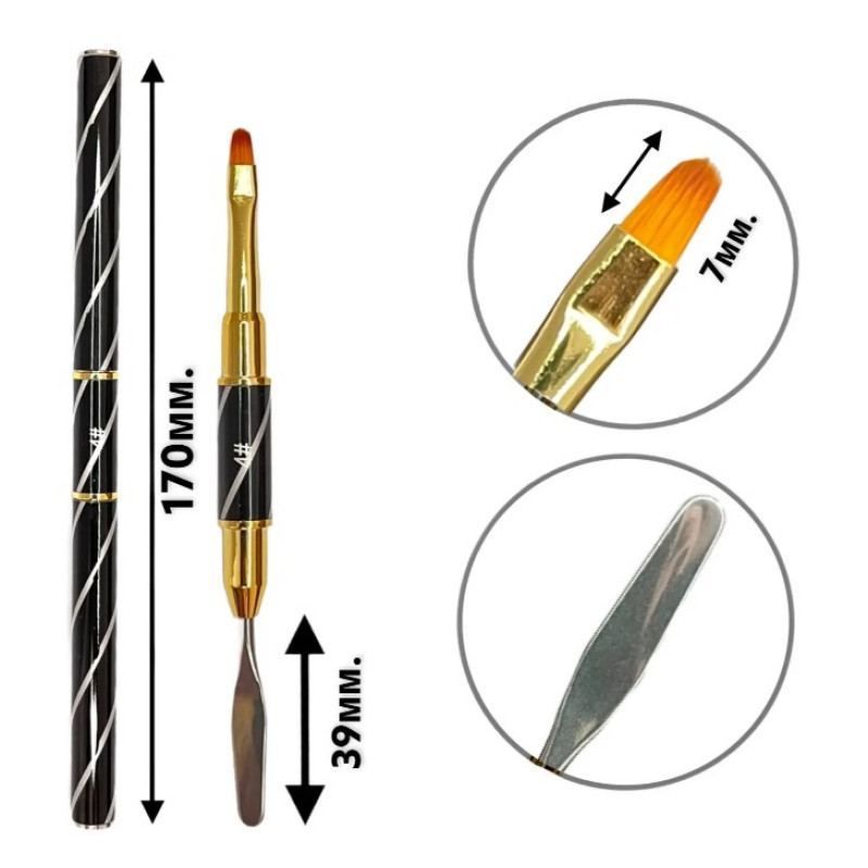 Професійний інструмент "2-в-1" для моделювання нігтів полігелем та акрилом. З одного боку розташований металевий шпатель довжиною 39 мм для набору матеріалу, з іншого — овальний синтетичний пензель довжиною 7 мм для його точного розподілу. Чорний глянцевий корпус прикрашений сріблястими лініями та золотистими деталями. Загальна довжина інструменту становить 170 мм, а захисні ковпачки забезпечують безпечне зберігання.