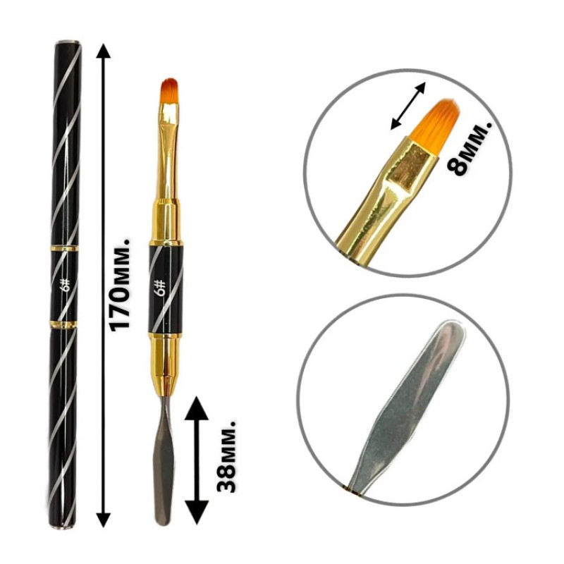Професійний інструмент №6 — це «золота середина» для майстрів манікюру. Оптимальний розмір овального ворсу (8 мм) дозволяє однаково зручно моделювати нігті середньої довжини та працювати з дрібними деталями. З одного боку інструмент оснащений пружним синтетичним пензлем, який не пушиться і плавно розрівнює полігель, а з іншого — сталевим шпателем (38 мм) для точного порційного набору матеріалу. Чорний матовий корпус із золотистими тримачами не ковзає в руці, а захисні ковпачки надійно бережуть ворс від ультрафіолету та пилу.