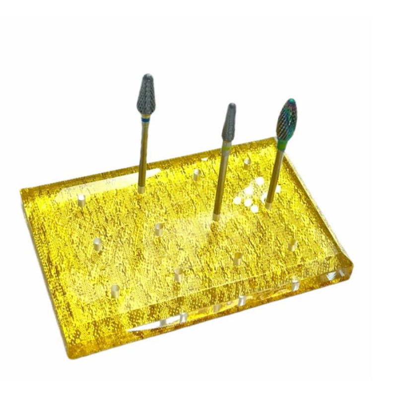 Додайте блиску своєму робочому столу за допомогою компактної підставки у розкішному золотому виконанні. Цей аксесуар створений для майстрів, які віддають перевагу максимально відкритому простору: відсутність кришки дозволяє змінювати насадки одним рухом, не відволікаючись від процесу манікюру. Плоска прямокутна форма забезпечує ідеальну стійкість, а 12 отворів розташовані так, щоб ви могли розставити фрези за етапами роботи — від зняття матеріалу до фінішного полірування. Високоякісний акрил з внутрішнім золотистим декором не тьмяніє з часом і легко очищується від пилу.