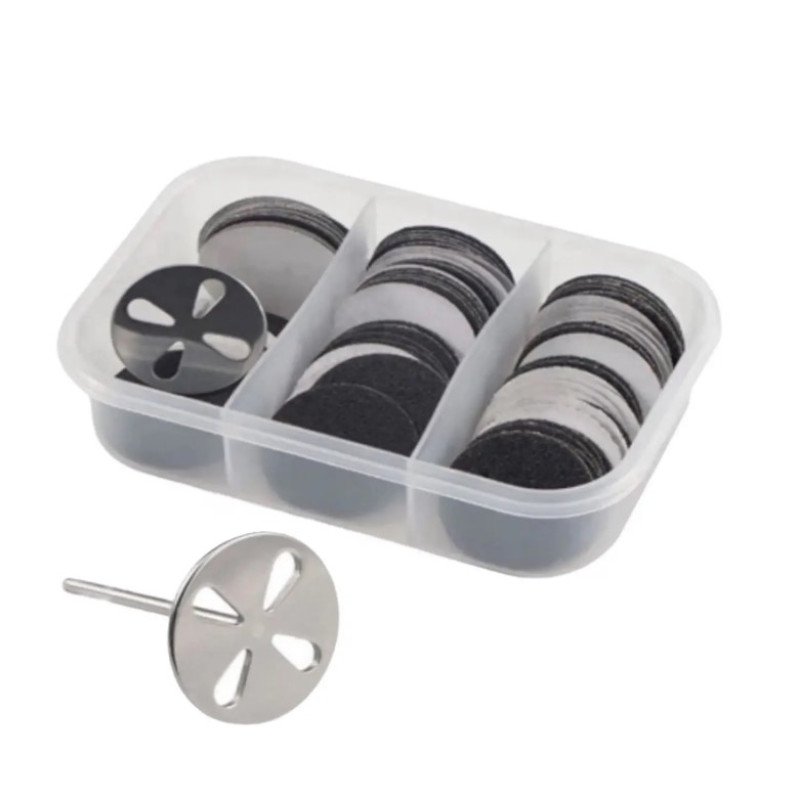 Комплект для подологів та майстрів нігтьового сервісу, що складається з багаторазового металевого диска-основи діаметром 35 мм та набору з 50 змінних абразивних файлів. Жорсткість 100 гріт оптимально підходить для інтенсивної обробки огрубілої шкіри, ефективного видалення натоптишів та первинного шліфування стопи. Сталева основа стійка до корозії та витримує всі етапи стерилізації, включаючи автоклавування. Використання одноразових наклейок, які легко кріпляться до диска та утилізуються після кожного клієнта, гарантує найвищий рівень гігієни та безпеки процедури.