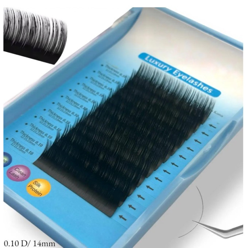 Максимальна довжина та інтенсивний завиток для драматичного погляду! Вії Luxury Eyelashes у вигині D товщиною 0.10 мм створені для майстрів, які працюють над яскравими сценічними образами або ефектом «Кім Кардаш'ян». Довжина 14 мм дозволяє створювати виразні акценти на зовнішніх куточках очей, а сильний вигин D візуально піднімає вії, роблячи погляд максимально відкритим. Кожна з 12 ліній виготовлена з преміального корейського моноволокна (Material from Korea), що поєднує насичений чорний пігмент та дивовижну легкість. Завдяки технологіям Silk Protein та Clean Lash, вії мають приємну шовковисту текстуру та відповідають високим стандартам гігієнічності.