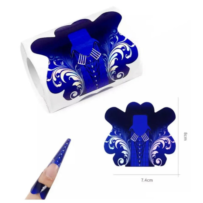 Відкрийте нові можливості моделювання з вишуканим дизайном! Професійні паперові форми глибокого синього кольору з флористичним орнаментом створені для тих, хто прагне ідеального результату. Завдяки ергономічній формі пелюсток та оптимальному розміру (7,4 х 8 см), вони забезпечують стабільну фіксацію на фаланзі пальця. Спеціальна розмітка дозволяє легко контролювати викладку матеріалу, формуючи чітку архітектуру нігтя. Високоякісний клей гарантує, що шаблон не зміститься під час роботи, забезпечуючи чистоту та точність кожної лінії.