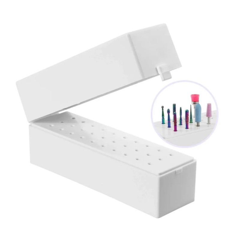 Цей лаконічний білий бокс — ідеальний спосіб організувати зберігання фрез у кабінеті або під час виїзних процедур. Завдяки прямокутній формі та щільній кришці на защіпці, підставка легко перетворюється на надійний кейс для транспортування, що запобігає пошкодженню насадок. Усередині розташовано 30 посадкових місць, що дозволяє зручно розділити інструменти за призначенням: від грубої обробки до фінішного шліфування. Міцний матовий пластик стійкий до механічних впливів та легко очищується дезінфікуючими засобами.